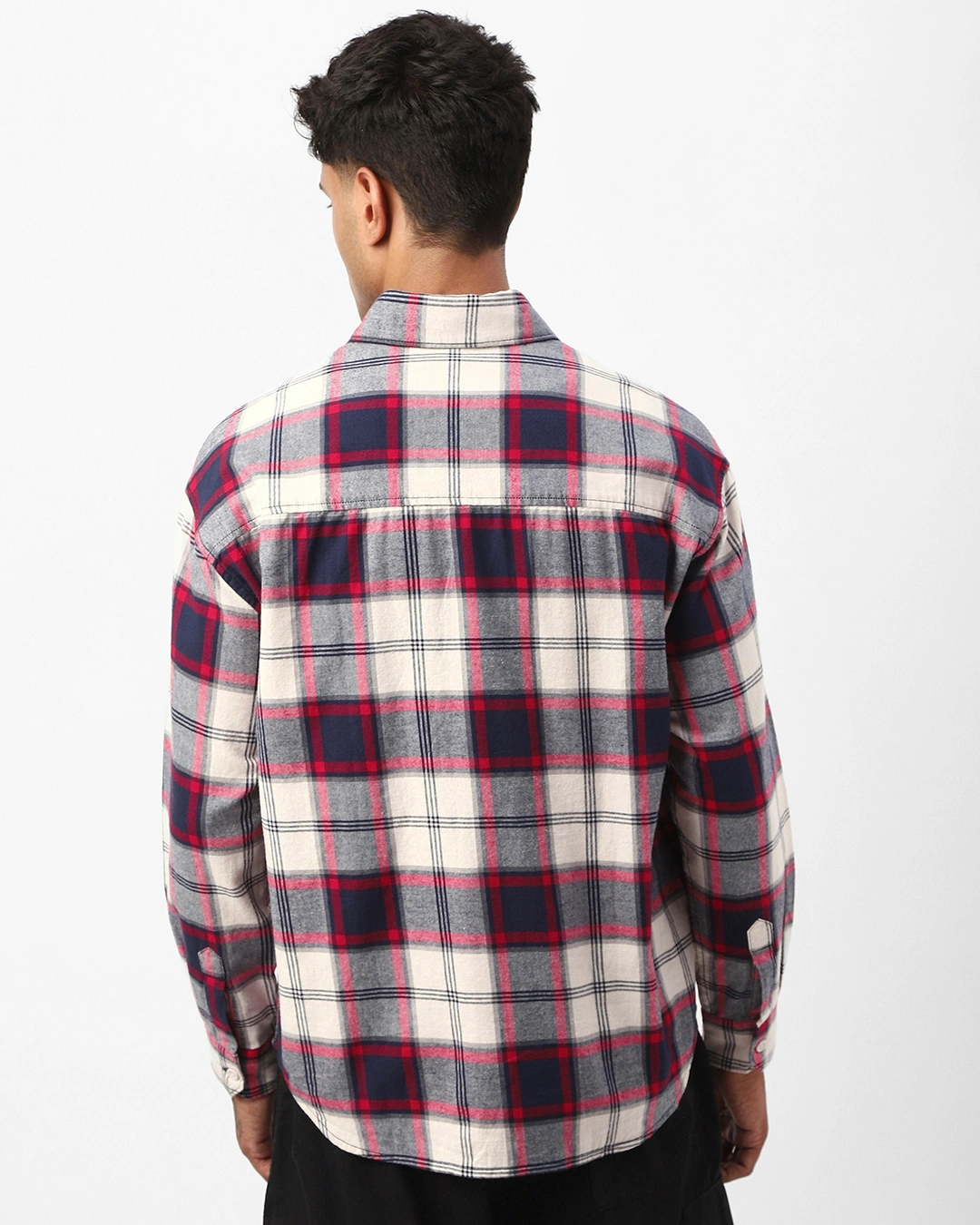 The Men’s Beige & Blue Checked Oversized Shirt is the ultimate layering essential. Wear it open over a graphic tee with baggy jeans and sneakers for that laid-back skater-boy aesthetic.
