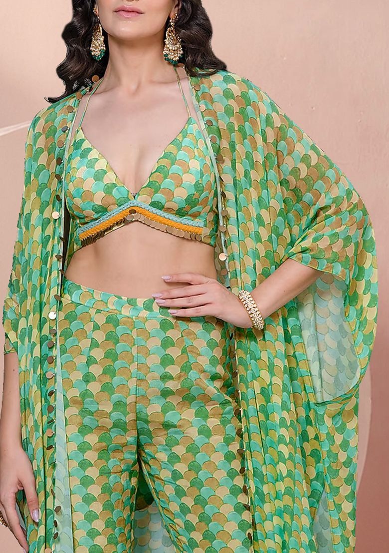 Green Jacket Set With Hand Embroidered Blouse And Palazzo – DFS00200