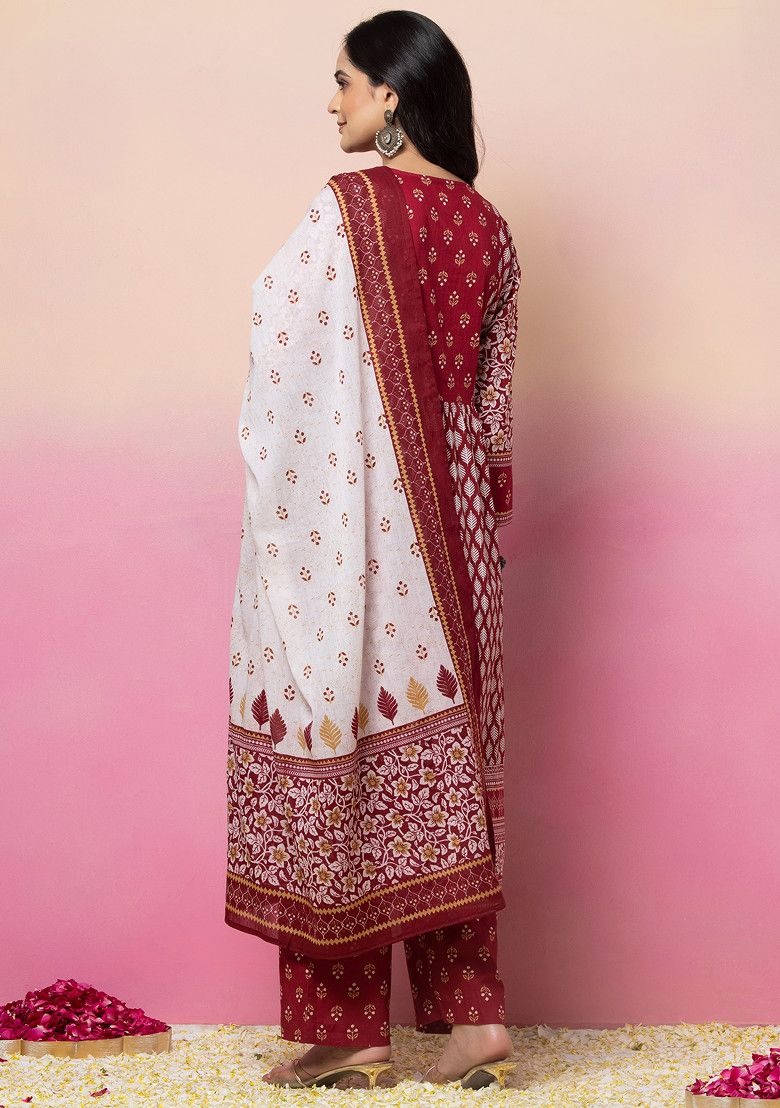 Add timeless charm to your ethnic wardrobe with this beautifully crafted red V-neck floral print kurta set. Made from 100% breathable cotton, this three-piece set includes a stylish kurta, coordinated straight pants, and a matching dupatta, offering unmatched comfort and elegance for all-day wear.